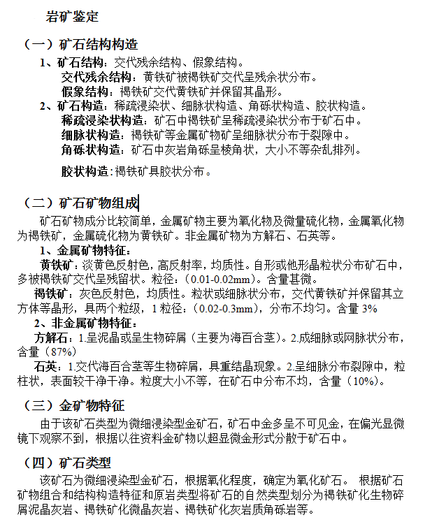 原礦物質成分測定包括分析礦石的結構構造、礦石礦物組成、 主要金屬與非金屬礦物特征、礦石類型。以下是對一金礦客戶 提供礦樣原礦物質成分測定的內容。