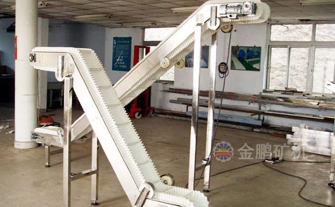波狀擋邊輸送帶中以大傾角波狀擋邊輸送帶最有名,大傾角波狀擋邊輸送帶又叫裙邊隔板輸送帶,是由基帶、擋邊、橫隔板3部分組成。擋邊起防止物料測滑撒落的作用。為便于繞過滾筒,檔邊設計成波紋狀;橫隔板的作用是承托物料,為了實現大傾角輸送,采用T型TC型。檔邊和橫隔板是用二次硫化的方法與基帶連接的,具有很高的連接強度。
